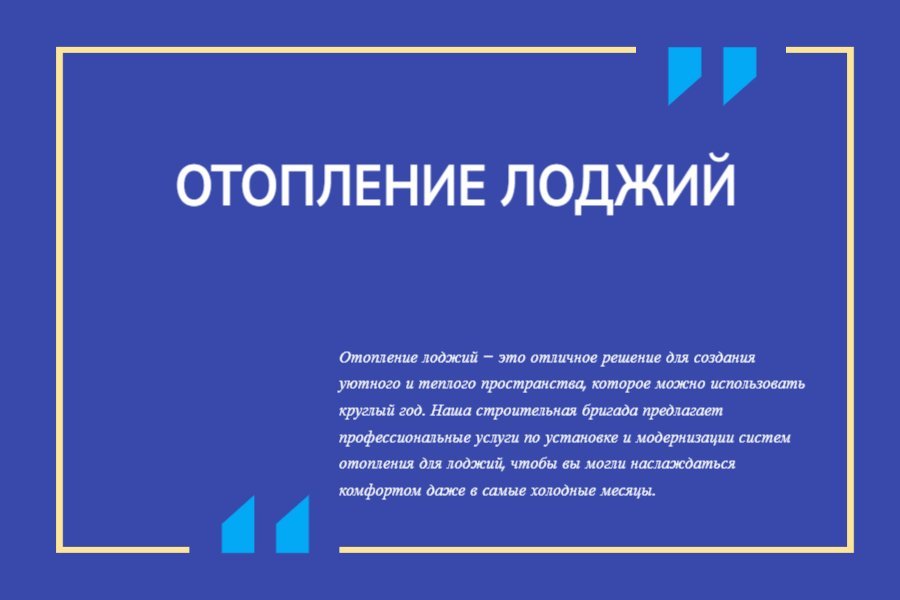 Наша строительная бригада имеет опыт в установке и модернизации систем отопления для лоджий и гарантирует высокий уровень сервиса и качества работы. Мы учитываем ваши пожелания и особенности вашей лоджии, чтобы создать идеальное решение для вашего комфорта.